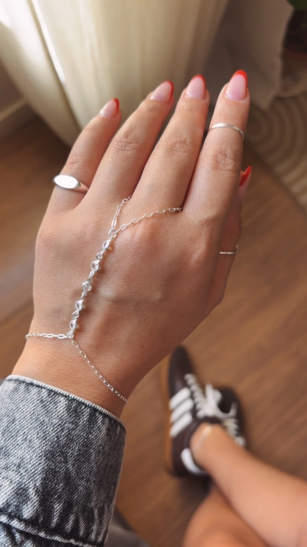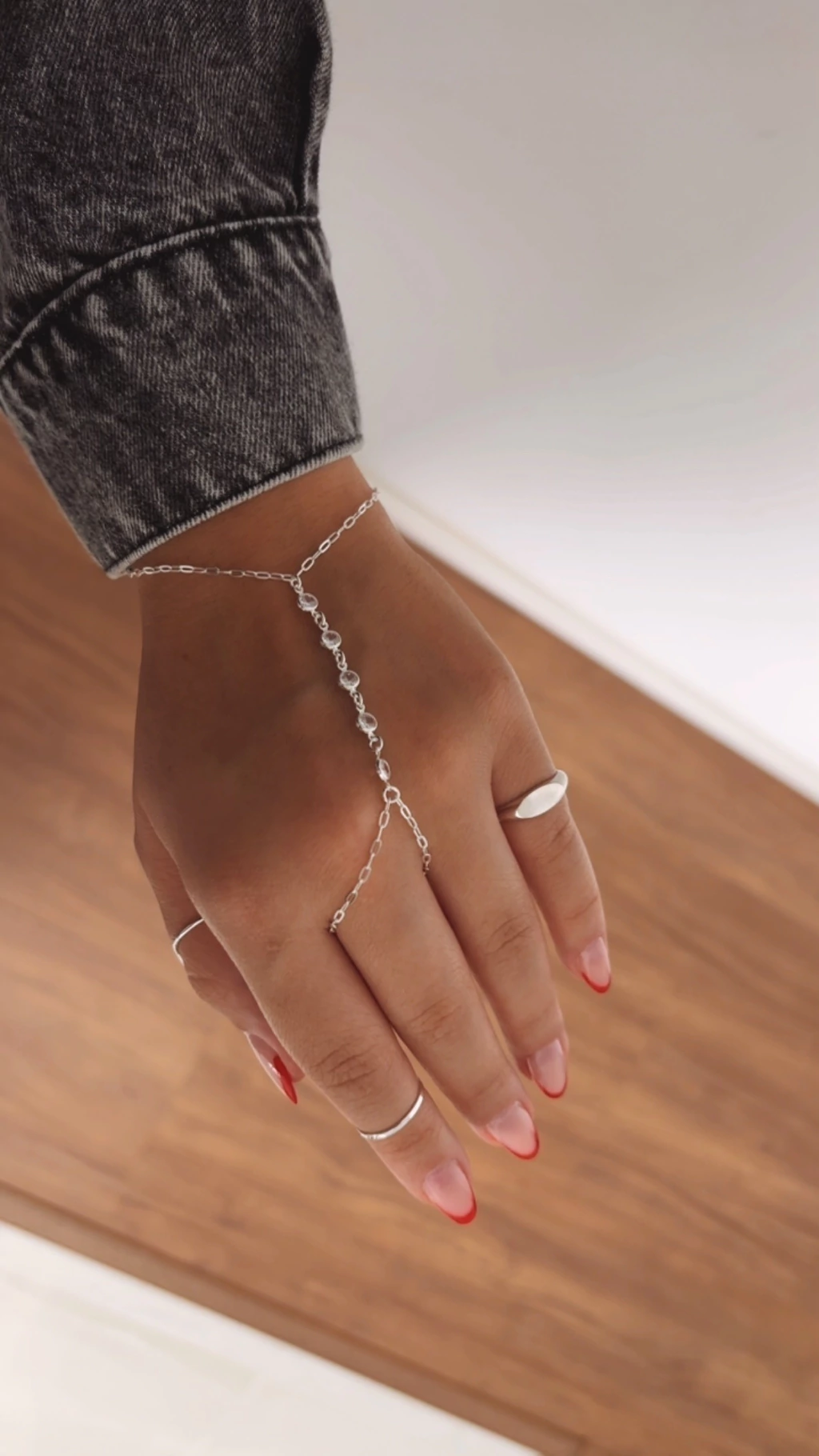 • acessório perfeito para quem ama peças modernas, delicadas e cheias de personalidade. Também conhecida como pulseira de mão, ela combina anel e pulseira em uma única joia, criando um visual sofisticado e marcante com zero esforço (: