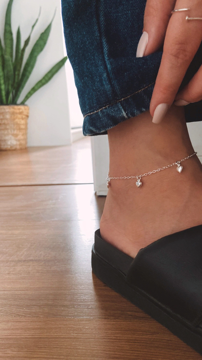 Delicada e super charmosa, essa tornozeleira traz 3 coraçõezinhos lisos de 5mm, pendurados ao longo da corrente, dando um movimento lindo e romântico ao usar.